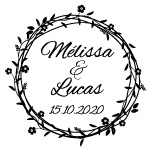Tampon de mariage personnalisable représentant une couronne de fleurs, ou une couronne de feuilles, avec prénoms et date.